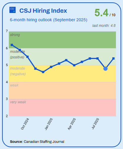 After months of subdued momentum, Canada’s hiring appetite is stirring again. The September CSJ Hiring Index rose to 5.4 out of 10, up sharply from 4.8 in August, signaling a tentative shift in employer sentiment as purchasing activity accelerates and some hiring pipelines reopen. Yet beneath the headline, the recovery remains patchy, driven by operations and logistics rather than a broad-based surge.