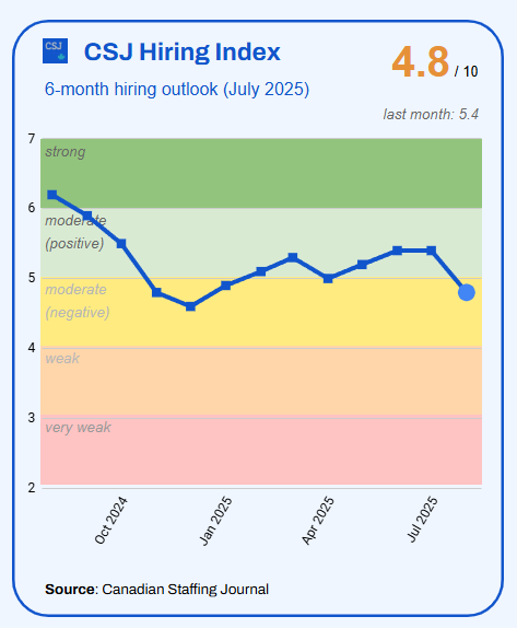 The August update highlights a cooling in Canada’s hiring appetite. While the Ivey PMI remains barely in expansion, both manufacturing and services slipped back into contraction. The Labour Force Survey reported a loss of 66,000 jobs and an unemployment rate rising to 7.1%. Vacancies have eased, wage growth remains modest at 3.2%, and SMEs are signalling caution. Together, these indicators explain the drop in the CSJ Index to 4.8, the lowest in over a year.