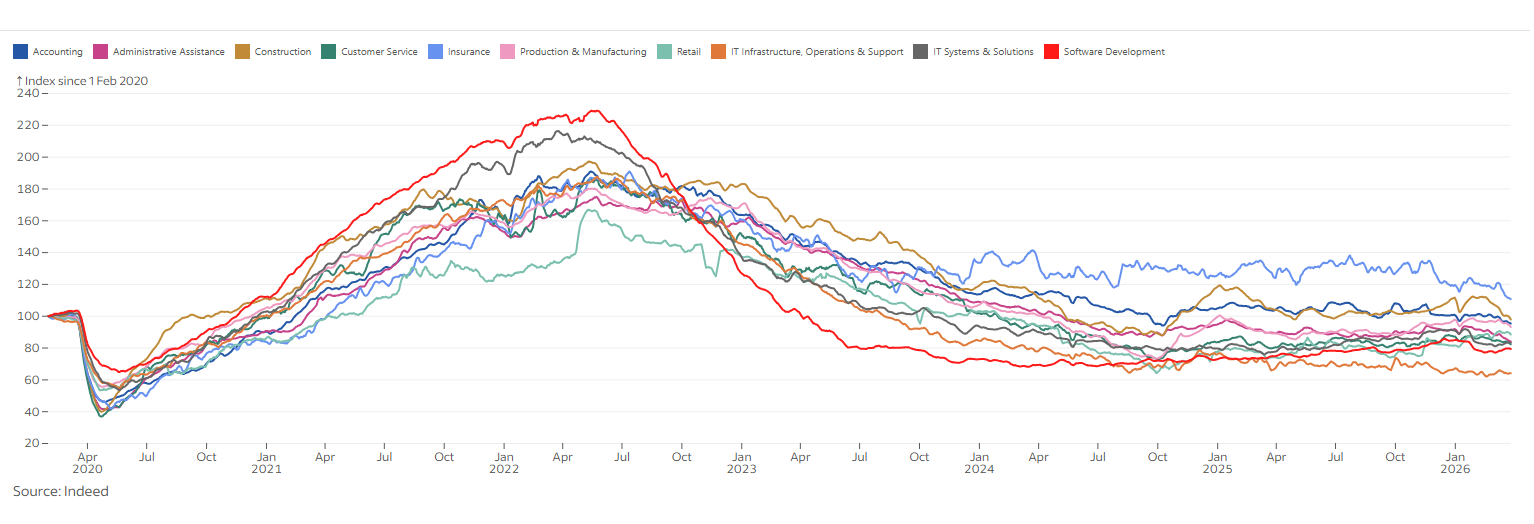 The current labor market landscape in early 2026 reflects a transition from the era of "growth at all costs" to a period of strategic automation and efficiency. The latest job posting data from Indeed helps to understand the story behind each sector, and which ones are still bearing job creation.