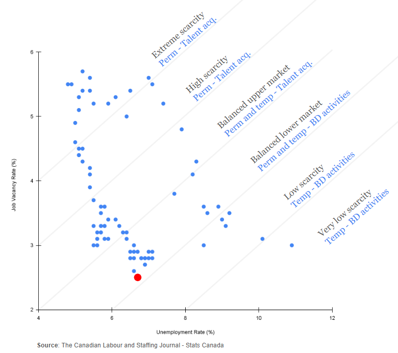 The Canadian labor market has reached a definitive turning point, marking the end of the post-pandemic "talent grab" and the beginning of a more challenging, client-driven era. To navigate this shift, staffing leaders must look beyond simple headlines and understand the mechanics of the Beveridge Curve (the inverse relationship between job vacancies and unemployment) and how it dictates the optimal strategy for a recruitment firm.